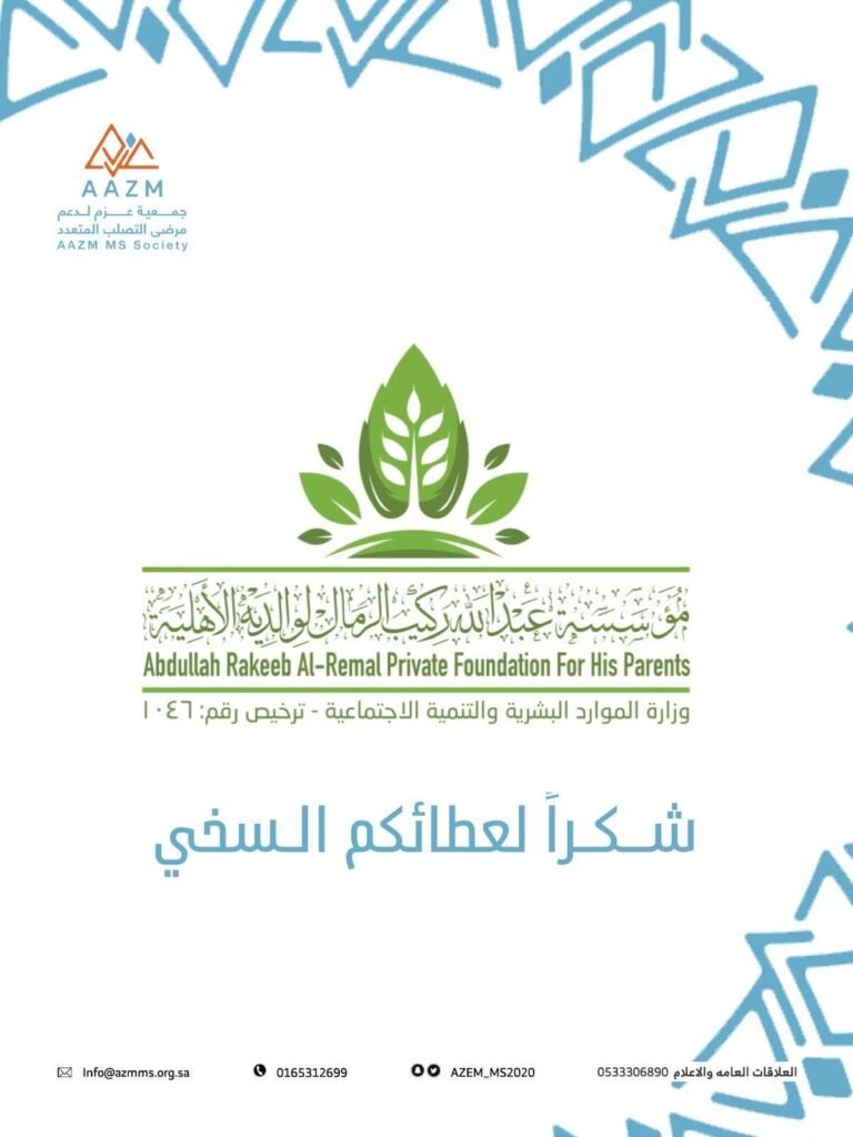 شكر وتقدير تتقدم جمعية عزم بالشكر والتقدير لمؤسسة عبدالله بن ركيب بن الرمال الخيرية لمساهمتهم في دعم برامج الجمعية .