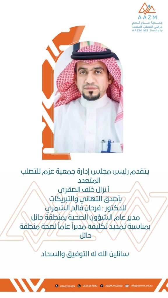 يتقدم رئيس وأعضاء مجلس إدارة جمعية عزم لدعم مرضى التصلب المتعدد وكافة منسوبيها بالتهاني والتبريكات للدكتور / فرحان فالح الشمري بمناسبة تمديد تكليفه مديراً عاماً لصحة منطقة حائل سائلين الله له التوفيق السداد