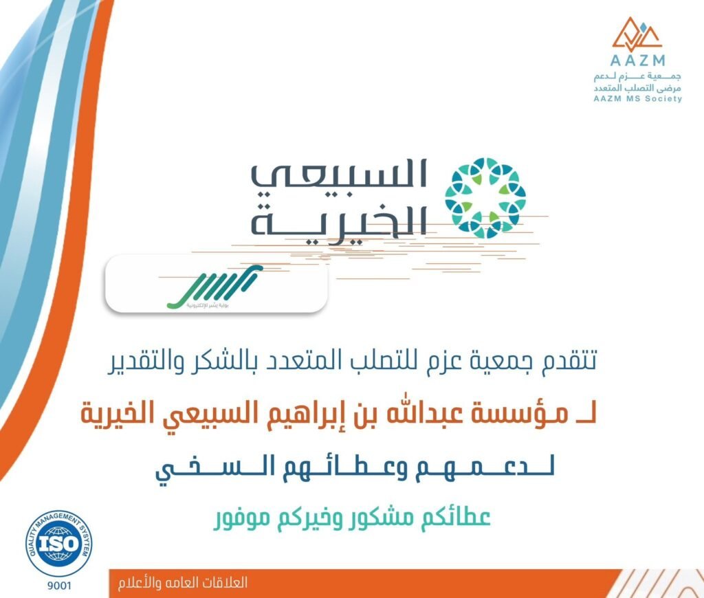 تتقدم جمعية عزم لدعم مرضى التصلب المتعدد بمنطقة حائل لمؤسسة عبدالله ابراهيم السبيعي الخيرية (يسر) لتكفلهم ودعمهم ببرنامج عمليات العيون وتصحيح النظر.