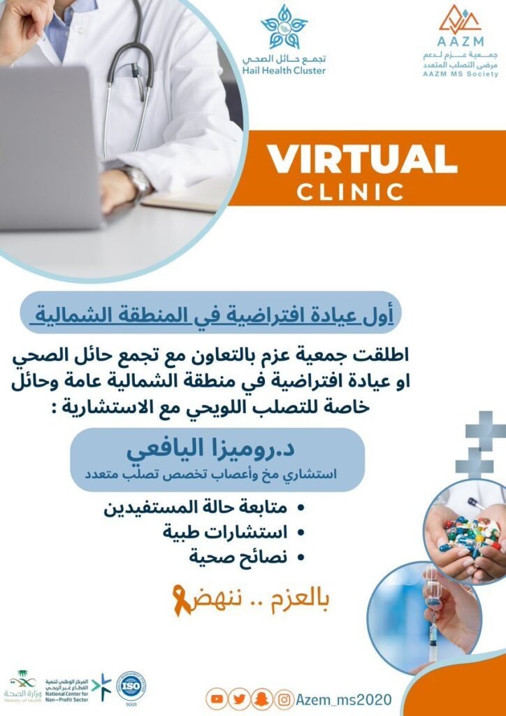 تقرر جمعية عزم لمرضى التصلب المتعدد نساهم بفكرة بسيطة لخدمة المجتمع، بتفعيل أول عيادة افتراضية بالمنطقة الشمالية بالتعاون مع تجمع حائل الصحي ومشاركة الدكتورة: روميزا اليافعي لتشخيص الحالات المرضية والاستشارات الطبية بطريقة سهلة وامنة.