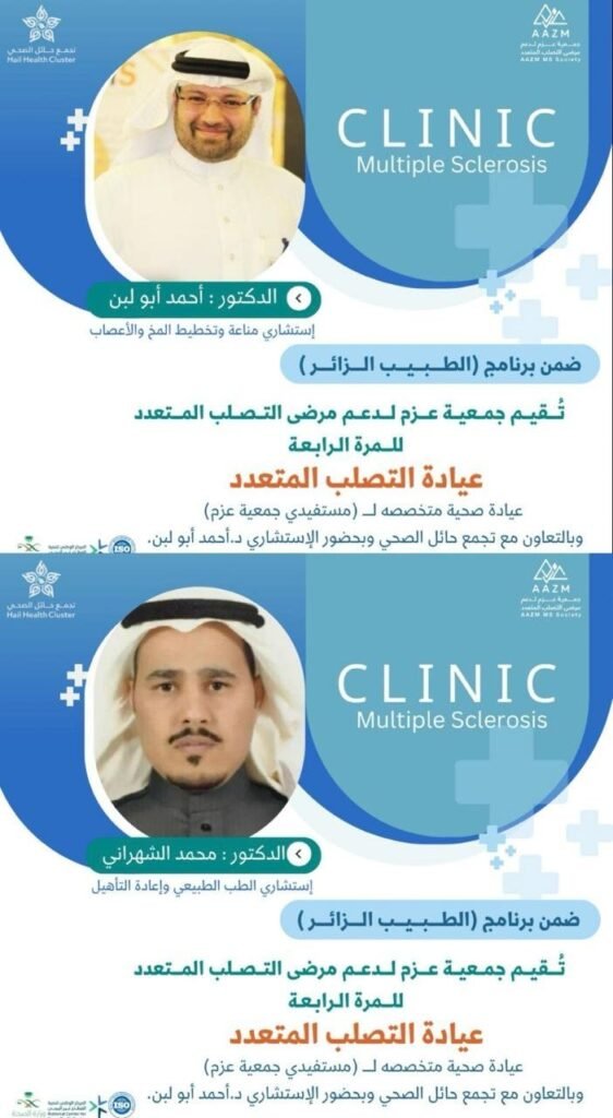 أقامت جمعية عزم لمرضى التصلب المتعدد بالتعاون مع تجمع حائل الصحي ضمن مراحل برنامج (الطبيب الزائر) بحضور الاستشاريين: د. أحمد أبو لبن د. محمد الشهراني #يهدف البرنامج إلى تسهيل وصول المرضى إلى الأطباء الاستشاريين للاستفادة من خبراتهم واستشاراتهم الصحية وتحسين جودة حياة المرضى